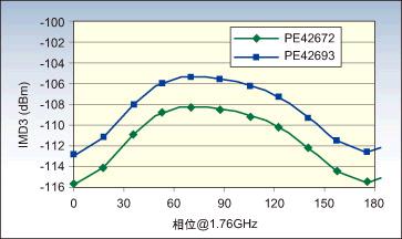 圖1:IP3與元件的第三階交調(diào)失真(IMD3)性能有關(guān)。該圖顯示了UltraCMOSSP7T(PE42672)和SP9T(PE42693)的這些相位上指標。