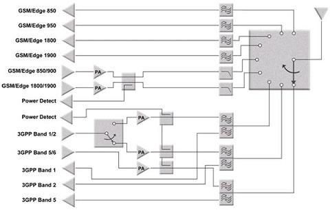 隨著多頻段架構(gòu)的普及,對功率放大器和相關(guān)濾波器的數(shù)量提出了嚴格的要求。事實上,對功率放大器的技術(shù)要求沒有變化,但手機設(shè)計需要使用更多的功率放大器。因此真正改變的,是需要一種高效率方法,將所有射頻信號傳送給天線──即單片開關(guān)。