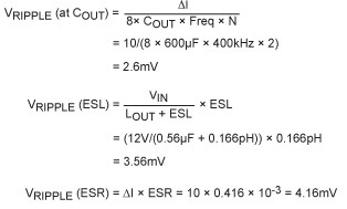 選擇輸出電容的關(guān)鍵參數(shù)是實際電容值、ESR、ESL和額定電壓。這些參數(shù)會影響系統(tǒng)的整體穩(wěn)定性、輸出電壓紋波以及瞬態(tài)響應(yīng),輸出紋波電壓包含三部分,即輸出電容儲存電荷的變化,電流流入、流出電容時在ESR和ESL上產(chǎn)生的壓降。下面給出了選擇電容使用的公式。