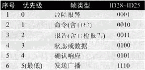 本協議采用幀優先原則分配標識符,每一幀標識符中的高四位表示幀類型,不同幀類型有不同的優先權,優先權決定了各種信息幀在同等情況下的發送順序,協議中的29位標識符的分配如下: