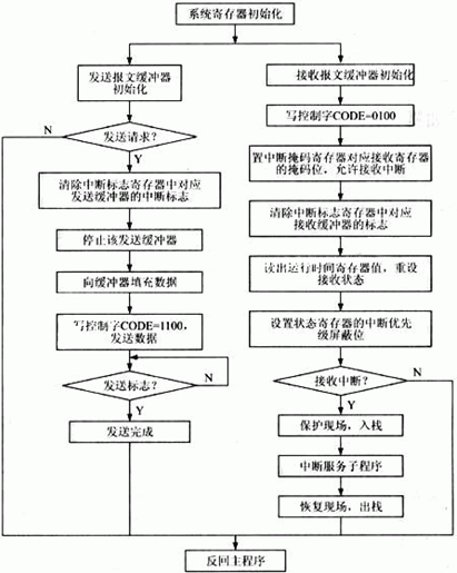 各控制器應按規定格式和周期發送數據到總線上,同時也要接受其他控制器的信息。總線上的其他控制器則根據需要各取所需的報文。對于接收數據,本系統采用中斷方式實現。一旦中斷發生,即將接收的數據自動裝載到相應的報文寄存器中,此時還可采用屏蔽濾波方式,利用屏蔽濾波寄存器對接收報文的標識符和預先在接收緩沖器初始化時設定的標識符進行有選擇地逐位比較,只有標識符匹配的報文才能進入接收緩沖器,那些不符合要求的報文則將被屏蔽于接收緩沖器之外,從而減輕CPU處理報文的負擔。此外,不同數據應放入不同的報文寄存器中,因此在接收中斷服務程序中,就可以容易地判斷出中斷是由哪個接收報文引起的,其程序流程圖如圖3所示。