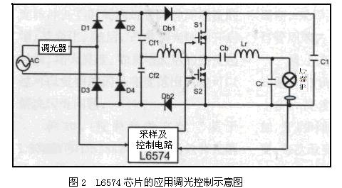 通過采樣燈電流以及調光器后面的輸入電壓的平均值,經過一定的比例調整后利用L6574內的誤差放大器對開關S1/S2的頻率進行調整,從而使諧振電路的阻抗變化對燈進行調光。