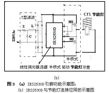 從圖3(a)可知,IRS2530D為8引腳控制IC,采用IR的專利鎮流器和高壓技術。一個高壓管腳可檢測半橋電流和電壓,以實現必要的鎮流器保護功能;DC調光輸入電壓基準與AC燈電流反饋相結合,可以實現單管腳調光;IRS2530D還具有內部非零電壓切換保護和內部振幅因數保護,防止燈泡故障損壞鎮流器。圖3(b)為IRS2530D與節能燈連接應用的示意圖。