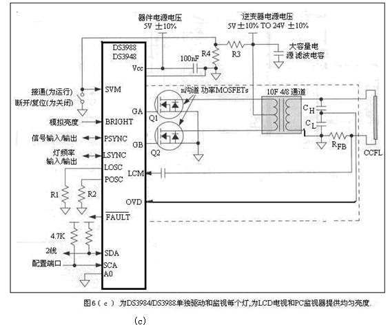 圖6(c)為用DS3984(4通道)和DS3988(8通道)CCFL控制器既解決了本文所提到的所有這些設計挑戰。可將這些器件配置為每個通道驅動一個燈,或者每通道多個燈,用戶可靈活裁減設計,以滿足自己的性價比目標。多個DS3984/DS3988可輕松級聯,以支持任意數量的燈,來為LCD電視屏提供背光照明。