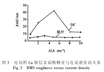 圖3為脈沖電鍍與直流電鍍電沉積Cu鍍層表面粗糙度RMS(rootmeansquare)與電流密度的關(guān)系。可見(jiàn)脈沖所得鍍層表面粗糙度僅為幾個(gè)納米,而直流所得鍍層表面粗糙度在10nm以上,最大時(shí)甚至達(dá)到了40nm,這樣大的粗糙度將為后續(xù)CMP工藝造成極大的困難。而平整的表面可以為CMP工藝提供一個(gè)易于進(jìn)行處理的基底表面,采用脈沖電鍍Cu鍍層的表面粗糙度RMS比直流電鍍的低。