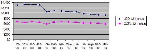 2009年10月~2010年10月北美42寸LED和CCFL背光電視的平均售價