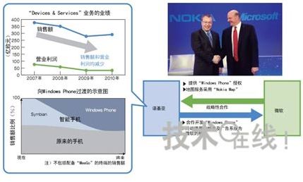 在移動(dòng)產(chǎn)品的全球最大規(guī)模展會(huì)“Mobile World Congress 2011”(2011年2月14~17日)開幕前的2月11日,諾基亞宣布了“歷史性”戰(zhàn)略轉(zhuǎn)換方針。該公司將與美國微軟進(jìn)行戰(zhàn)略合作,合作內(nèi)容包括采用“Windows Phone”作為智能手機(jī)的主要平臺等(圖1)。
