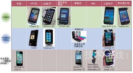 智能手機(jī)的平臺集中在Android、Windows Phone以及各廠商自主產(chǎn)品這三個(gè)平臺上。本圖以各廠商2011年發(fā)布的機(jī)型為中心,只標(biāo)示了具有代表性的產(chǎn)品。采用自主平臺的廠商還自行準(zhǔn)備了應(yīng)用商店等網(wǎng)絡(luò)服務(wù)。