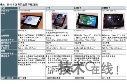 2011年1月,美國摩托羅拉移動(dòng)公司(Motorola Mobility)發(fā)布了配備Android 3.0的平板終端“XOOM”,以此為開端,2011年2月韓國LG電子和三星電子分別發(fā)布了“Optimus Pad”和“GALAXY Tab 10.1”。HTC采用Android 2.3投產(chǎn)的首款平板終端“HTC Flyer”計(jì)劃升級至Android 3.0(表1)。2010年收購了美國Palm的美國惠普(Hewlett-Packard)也涉足了平板終端市場,并于2011年2月發(fā)布了“HP TouchPad”,采用Palm面向智能手機(jī)OS開發(fā)的“webOS”。
