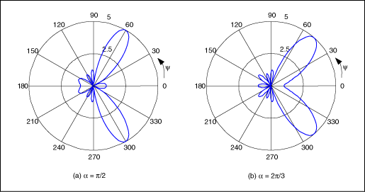 除了改變波瓣的寬度,通過對連續單個天線的信號設定固定的相位延遲α(圖3),還可以實現主波瓣在x–y平面內的旋轉。天線陣列的輻射圖正比于天線陣列系數F(u):