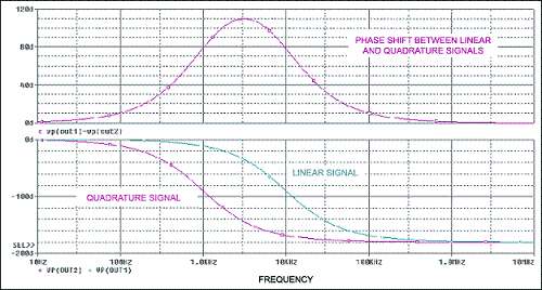 圖8.圖7電路的頻率響應,在1kHz至10kHz整個頻率范圍內提供近似的90°相移。