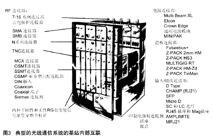 圖3表示的是典型的無線通信系統的基站內部互聯,以及它所需要的各種各樣的電子連接器。從圖中可以看出,左邊基站所要求的都是射頻連接器,右邊表示的是電源連接器、背板連接器、輸入/輸出連接器和印制電路板連接器。