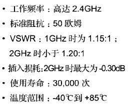 移動手機用的開關式同軸連接器主要用于提供手機內的天線和汽車外部天線之間的信號的切換。這種開關式的連接器,它的表面安裝有三種高度,分別是3.5mm、4.5mm和6.0 mm。表面安裝開關式連接器直接和手機天線連接。由于功率元件和天線或開關間距離短,因此內部沒有電纜,信號傳輸非常好。它的性能指標如下: