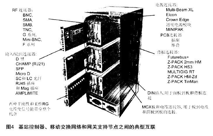 圖4表示的是基站控制器、移動交換網絡和網關支持節點之間的典型互聯。這些互聯也用到了多種連接器。