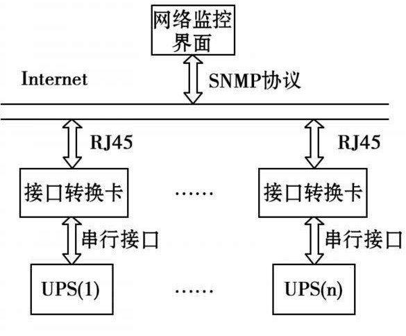 整個系統(tǒng)的核心為基于SNMP網(wǎng)絡(luò)管理協(xié)議的接口轉(zhuǎn)換卡。接口轉(zhuǎn)換卡一端通過網(wǎng)線與監(jiān)控計算機(jī)相連,管理人員通過計算機(jī)可方便地對其進(jìn)行操作。接口轉(zhuǎn)換卡另一端通過與UPS上的串行接口連接,來獲取UPS工作的各種信息及參數(shù),然后再利用SNMP協(xié)議將接收到的數(shù)據(jù)轉(zhuǎn)換為管理信息庫(MIB)節(jié)點(diǎn)的變量值。管理員通過網(wǎng)絡(luò)管理軟件對MIB節(jié)點(diǎn)變量進(jìn)行操作,從而獲得各UPS的監(jiān)控信息,實(shí)現(xiàn)了安全可靠的遠(yuǎn)程分散式管理。