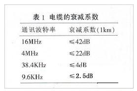 導(dǎo)線的電阻對信號的影響很小,可以忽略不計(jì)。電纜的分布電容C主要是由雙絞線的兩條平行導(dǎo)線產(chǎn)生。信號的損失主要是由于電纜的分布電容和分布電感組成的LC低通濾波器。通訊波特率越高,信號衰減也會越大。常規(guī)電纜的衰減系數(shù)見表1。