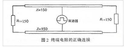 ②阻抗不連續(xù)。顧名思義,與光從一種媒質(zhì)進(jìn)入另一種媒質(zhì)時(shí)所引起的反射是相似的。信號在傳輸線末端突然遇到電纜阻抗很小甚至沒有,信號在這個(gè)地方就會引起反射。消除這種反射最常用的方法,是在電纜的末端跨接一個(gè)與電纜的特性阻抗同樣大小的終端電阻,使電纜的阻抗連續(xù)。由于信號在電纜上的傳輸是雙向的,因此,在通訊電纜的另一端同樣要跨接一個(gè)相同大小的終端電阻,如圖2所示。