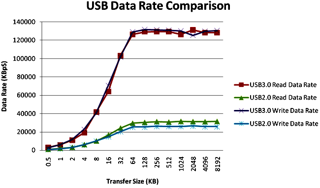 USB 2.0和USB 3.0的基本區(qū)別是帶寬。USB 2.0所提供的理論帶寬是480Mbps。事實(shí)上,收到的最大吞吐量約為320Mbps (40MBps),它大致是理論值的三分之二。使用USB3.0,數(shù)據(jù)吞吐量為4.8Gbps。如果我們用相同的比例,那么預(yù)期的數(shù)據(jù)速率是3.2Gbps (400MBps)。然而,許多開發(fā)人員希望能提供更高的吞吐量。圖1顯示了USB 3.0 和USB 2.0用于Buffalo外部存儲(chǔ)磁盤進(jìn)行不同大小文件傳輸?shù)臄?shù)據(jù)率差異。應(yīng)該指出的是,USB 3.0數(shù)據(jù)速率受儲(chǔ)存設(shè)備約束,否則400 Mbps的數(shù)據(jù)速率很容易達(dá)到。