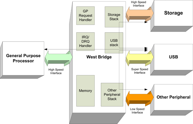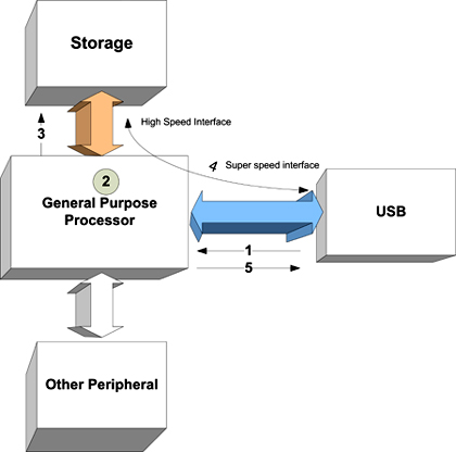 在一個(gè)普通的場(chǎng)景中,在device端,處理器直接連接到USB、存儲(chǔ)器和外設(shè)。記住這種結(jié)構(gòu),由High-Speed過渡到SuperSpeed,處理器的影響可以概括如下: