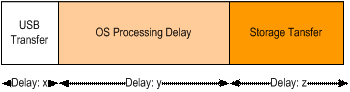 3.延遲Z是指數(shù)據(jù)在USB和存儲(chǔ)設(shè)備之間傳輸所需的時(shí)間,這取決于請(qǐng)求類型。還取決于直接存儲(chǔ)器存取結(jié)構(gòu)和存儲(chǔ)設(shè)備類型,并不取決于USB速度,因?yàn)檫@里瓶頸會(huì)是存儲(chǔ)速度而不是USB速度(如SuperSpeed)。延遲Z可能在幾毫秒和數(shù)微秒之間,取決于存儲(chǔ)設(shè)備類型和數(shù)據(jù)大小。
