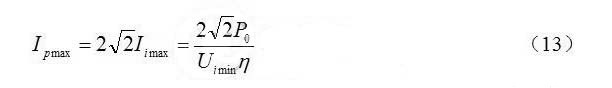為避免音頻噪聲,在輸入電壓范圍內,開關頻率應在20kHz以上。從以上分析可知,在最高輸入電壓峰值時,開關頻率最低。故假定在最高輸入電壓峰值的開關周期為50μs.由式(11)求得