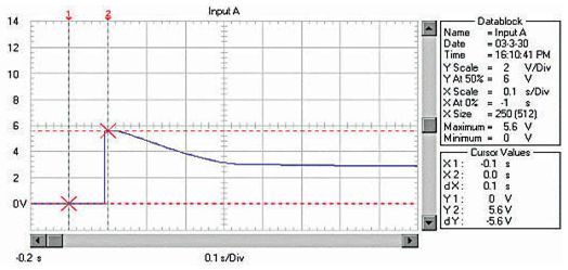 由于RM、RB、RL均非常低,啟動電流非 常大。例如用12V、45Ah的蓄電池啟動安裝1.9升柴油機的汽車,蓄電池的電壓在啟動瞬間由12.6V降到約3.6V!啟動過程的蓄電池電壓波形如圖 1;啟動瞬時的電流達550A,約為蓄電池的12C的放電率!啟動過程的蓄電池電流波形如圖2,(電流傳感器的電流/電壓變換比率:100A/V)。盡管 車用蓄電池是啟動專用蓄電池,可以高倍率放電,但在圖1中可以看出,10倍以上的高倍率放電時的蓄電池性能變得很差,而且,如此高倍率放電對蓄電池的損傷 也是非常明顯的。啟動過程的電壓劇烈變化也是極強的電磁干擾,可以造成電氣設備的“掉電”,迫使電氣設備在發電機啟動過程結束后重新上電,計算機在這個過程中非常容易死機。因此,無論從改善汽車電氣設備的電磁環境還是改善汽車的啟動性能和蓄電池的性能、延長使用壽命來考慮,改善汽車電源在啟動過程的性能是必要的。