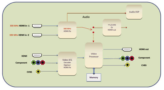 以4K系統為例,圖1所示的是一個典型的支持4K的系統。支持300MHz的接口由HDMI來實現。系統接收了4K的信號后,可以以兩種方式處理: