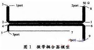 微帶定向耦合器在ADS中的模型如圖1所示。是一個四端口器件,中間是一段耦合線。四個端口分別連接于外部的50Ω端口。從5點到7點是高阻抗線,7端點接地,這個長度是一個變量。連接每個端口(3端口除外)的微帶線寬度是2.25mm,長度是14.4mm,3端口連接的微帶線寬度是1.4mm,長度是5mm。耦合線的長度是57.7mm,導帶寬度是2.1mm,導帶間距是O.45mm。本文主要討論高阻抗線的作用,所以先將高阻抗線長度置于零。PCB板采用PTFE材料,介電常數是2.5,厚度是0.5cm。
