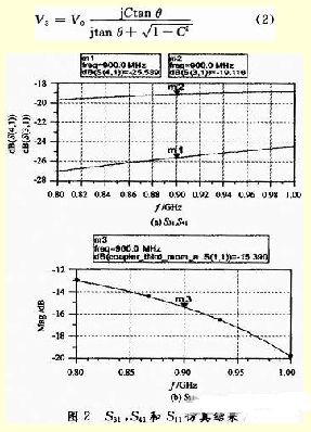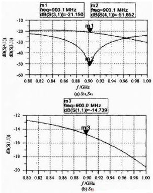 高阻抗線的一個重要結論是,其終端到耦合端的電長度大約為90°。根據微帶耦合器理論,要達到最佳的耦合效果,耦合端和隔離端的長度大約為90°,信號相位也相差90°。反射信號要與隔離端信號相差180°,在高阻抗線終端反射回耦合端的信號與耦合端原信號必須反向,這樣才能在傳輸90°以后和隔離端的信號正好反向。另外通過改變高阻抗線的線寬,可以調節反射信號的強弱。遵循這一原則,通過對高阻抗線的調節,使得耦合器在 903MHz時,達到-50dB的隔離度,并使定向性達到30dB以上。