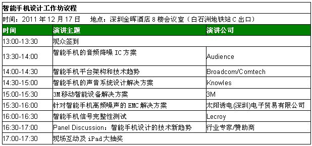 HTC、SAMSUNG、LG、SHARP、AT&T、SK Telecom、PANTECH、DoCoMo 等手機設計領軍廠商在智能市場領域的競爭非常激烈,他們都用到哪些技術?由我愛方案網(www.52solution.com)、電子元件技術網(m.mengyueyun.cn)和China Outlook Consulting主辦的首屆智能手機設計工作坊(Smart Phone Design Workshop)將于2011年12月17日下午在深圳金暉酒店8樓會議室隆重召開!為您Hold 住 2012 智能趨勢,給力手機開發設計!