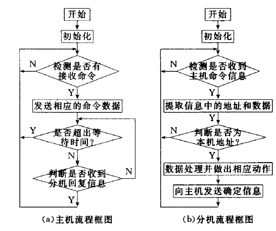 分機上電復位后進行初始化,然后等待接收主機發送的命令信息。接收到命令信息后,從中提取地址和數據信息,若為本分機地址,則對數據進行處理并作出響應,同時向主機發送確定信息;若非本分機地址,則返回,繼續等待主機發送的命令信息。分機主程序流程圖如圖6(b)所示。