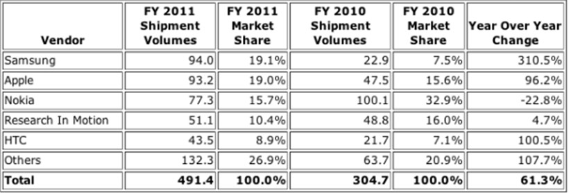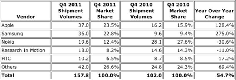• 2011年第4季度全球智能手機(jī)銷量同比增長(zhǎng)了54.7%
