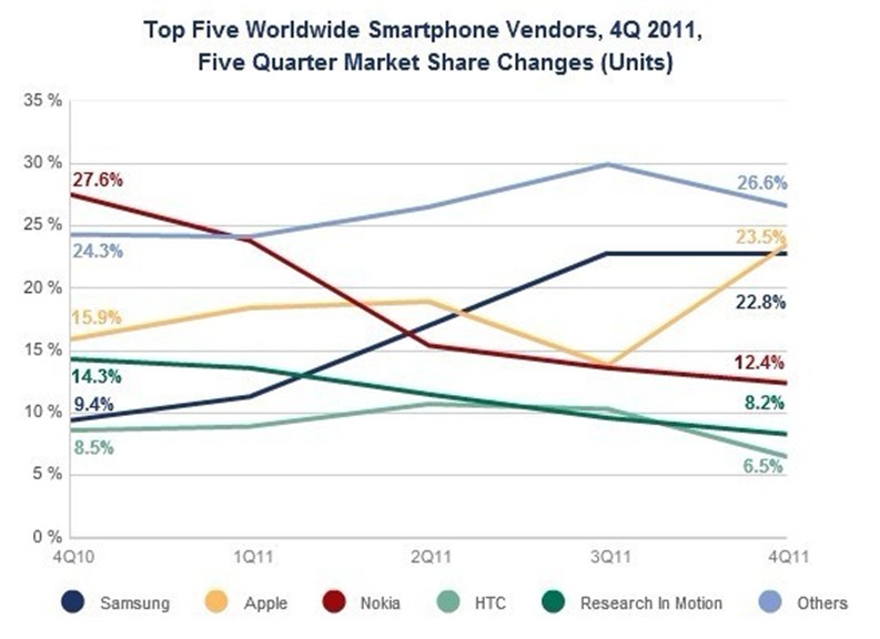2011年全球前五大手機(jī)廠商市場(chǎng)份額變化情況
