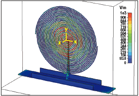 本例中使用的螺旋輻射結構非常適于此種工作模式,但是不再需要與帶有吸收體的腔體連接使用。使用這種結構可以創造兩種類型的天線:雙向結構,這種結構允許螺旋天線自由地向空間中其平面法線的兩個方向輻射;或增益更高的單向結構,這種結構中反射極緊靠螺旋天線使一個方向的輻射被反射回來,因此使前向增益增強。圖4給出了一個雙向螺旋天線。注意到其獨有特征可以擴展頻率覆蓋范圍。圖5給出某同類型天線的電磁仿真。圖6給出類似這種雙向螺旋天線的輻射特性。