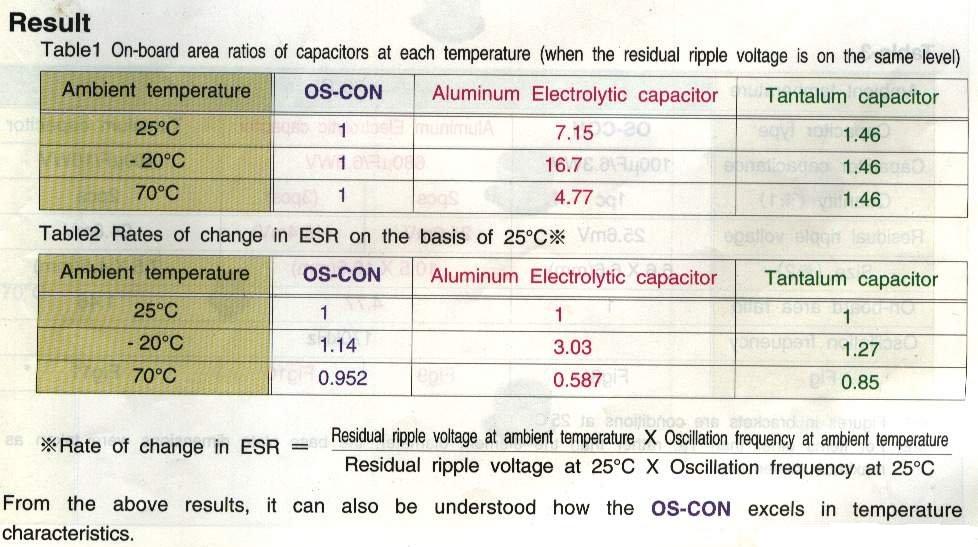 而上圖的表格則表明了,在L/C部分使用不同種類電容的情況下,這個(gè)電路中漣波電壓的表現(xiàn)情況。可以看出,具有LOW ESR性能的鋁固體聚合物導(dǎo)體電容(左邊),其消除漣波電壓的性能最強(qiáng),鉭二氧化錳電容(右邊)性能次之,鋁電解液電容(中間)表現(xiàn)最差。同時(shí)最后的數(shù)值還將受溫度影響,這點(diǎn)我們還將在后面詳細(xì)說明。