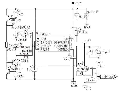 方案①:利用NE555產生三角波。該電路的特點是采用恒流源對電容線性沖、放電產生三角波,波形線性度較好、頻率控制簡單,信號幅度可通過后加衰減電位器控制。