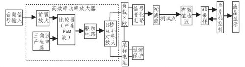 方案①:數字方案。輸入信號經前置放大調理后,即由A/D采入單片機進行處理,三角波產生及與音頻信號的比較均由軟件部分完成,然后由單片機輸出兩路完全反向的PWM波給入后級功率放大部分,進行放大。此種方案硬件電路簡單,但會引入較大數字噪聲。