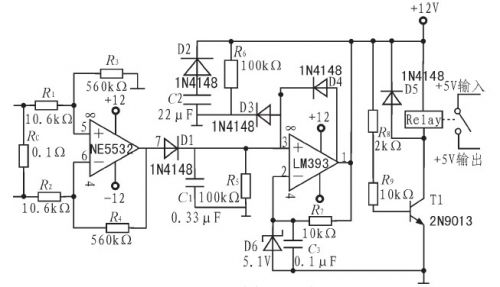 經過放大后的信號經過由D1、C1、R5組成的峰值檢波部分,檢出信號幅度值送至比較器與設定的基準電壓進行比較。比較器選用低功耗、響應速度較快的雙路比較芯片LM393.比較器負端用穩壓管D6及C3、R7設置為5.1V,比較器接成遲滯比較方式,一旦過流,即可自鎖。此時比較器輸出的高電平使三極管T1導通,繼電器的地控制端與地聯通,繼電器吸合,切斷功放部分的供電,達到保護目的。因比較器自鎖,所以在解決過流問題后,關斷保護模塊的電源,才能重新進入保護狀態。D2、D3、R6、C2組成開機延時電路,在斷電后,C2通過D2快速放電,防止開始瞬間C2上的殘余電壓對3號腳影響,防止比較器在非正常狀態下進入自鎖狀態,使保護模塊不能發揮正常作用。
