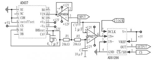 輸入綴用OPA604構成一射極跟隨器已達到隔離前后級的作用。改變平均電容的值可設定平均時間常數,并決定低頻準確度、輸出波紋的大小和穩定時間。交流波紋分量可以用增大此電容的值來減少,但這樣會使建立時間增大,所以選擇用后接一個二階有源低通濾波器的方法來減少輸出的紋波。得出真有效值后直接給入ADS1286進行模數轉換,再由FPGA處理,計算出系統的輸出功率并進行顯示。