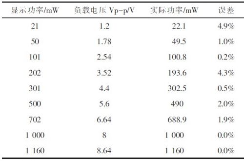 1)功率顯示誤差測量用Agilent信號源給出輸入音頻信號,示波器在單端輸出測試點測負載上電壓峰值Vo,據式計算出實際功率,進而計算出顯示誤差,結果見表1所示。