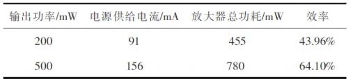 3)效率測量 用直流電源對功放電路單獨供電,以便測試效率。供電電壓+5 V.用與測通頻帶相同的方法給出給出輸入信號,用示波器觀察輸出信號幅值,調整輸出為200 mW及500 mW,將四位半數字多用表串入放大器電路中,測出電路電流I.根據式計算出功率放大器效率,結果見表2所示。