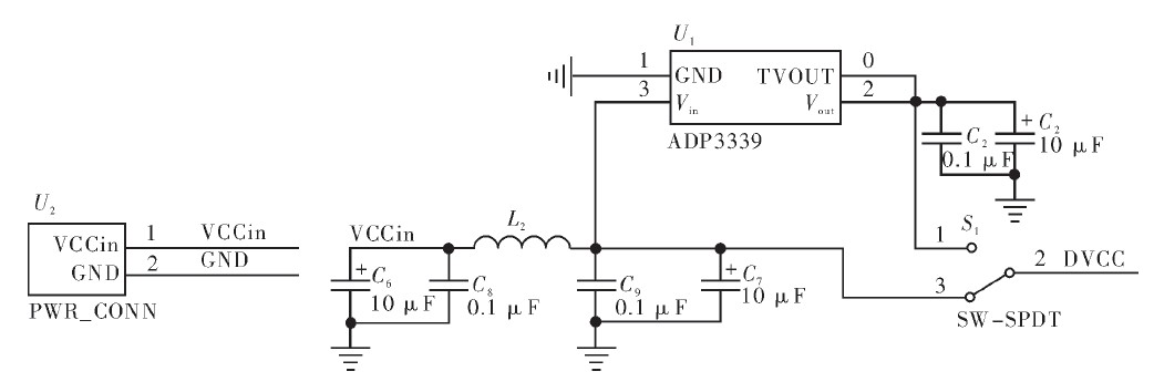 傳感器節點體積微小,通常攜帶能量有限的電池。能量供應模塊在無線傳感器節點中至關重要,為傳感器節點各部分提供能量。需要長時間數據采集的傳感器有的需要太陽能等方式來維持節點的正常運轉。節點的各部分也需要精心設計。節點微處理器的工作電壓為1.8~3.6 V,無線射頻芯片工作電壓為2.1~3.6 V,Flash供電電壓為2.7~3.6 V,USB轉換芯片由USB供電。因此電源可以選用3 V紐扣電池供電,有效減少了節點的大小。另外USB也可以作為供電源,同時作為編程電源,電源單元如圖2所示。LC濾波單元對交流電具有較好的濾波效果,同時又不會降低直流輸出電壓。低壓差的穩壓器ADP3339保證了電源較好的穩壓性。
