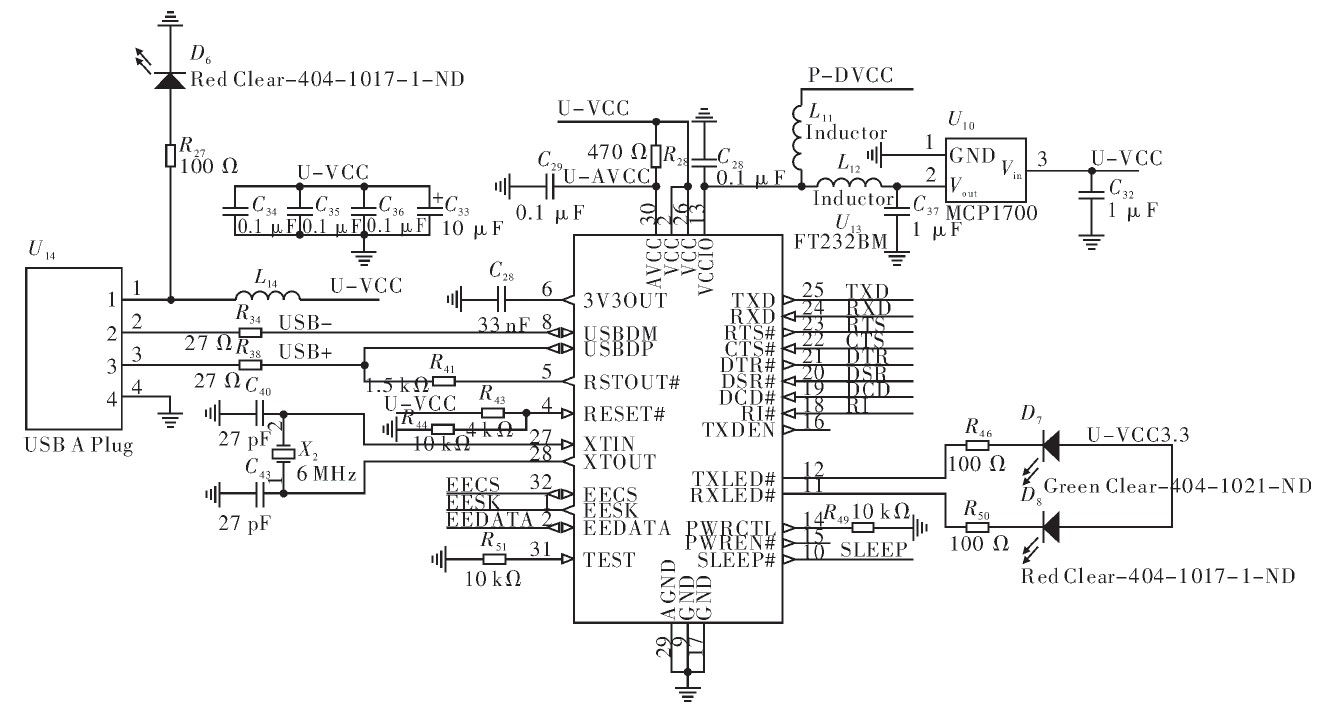 無線傳感器網絡由大量節點組成,這些節點按一定協議將采集的數據進行融合、傳輸,最終將數據傳送到個人電腦上進行處理和觀察,同時節點工作需要將特定的程序寫入Flash中。目前個人電腦最常用的接口為USB,而微處理器使用USART接口,為實現兩種接口之間轉換,節點使用FT232BM芯片作為轉換芯片。FT232BM是一種單片USB到異步串口轉換芯片,支持全握手和調制解調接口信號,在TTL級數據傳輸速度范圍為300 bit·s-1~3 Mbit·s-1.芯片通過USB總線供電,工作電壓為4.35~5.25 V,采用外部6 MHz時鐘。USB PID、序列號和產品信息可以保存在外部EEPROM中。USB通信模塊接口如圖5所示。