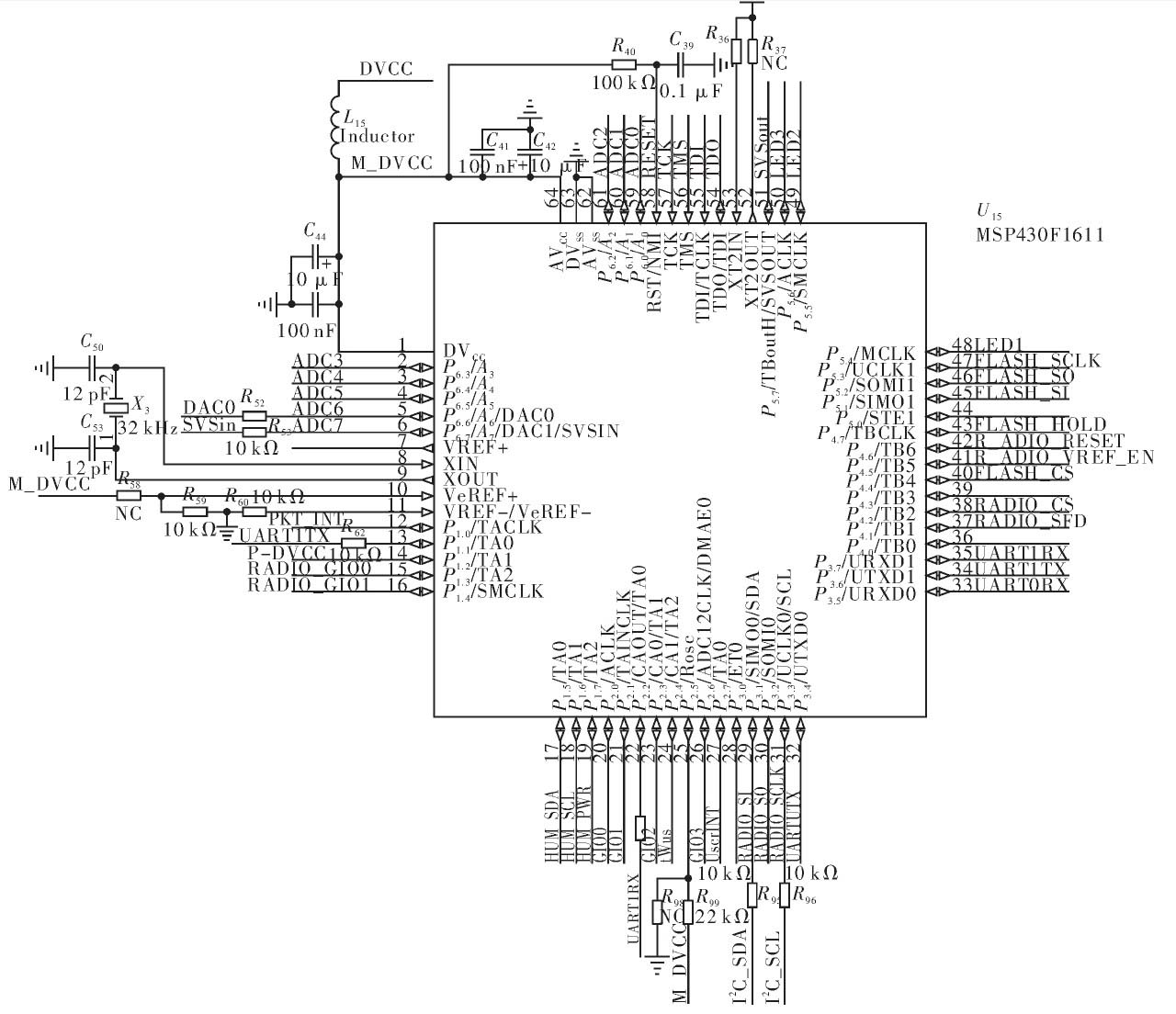 微處理器是無線傳感器節點的核心,傳感器數據的數據處理,串行口以及無線模塊的傳輸與控制均需要微處理器的參與。節點微處理器TI公司的16為超低功耗MSP430F1611.該微處理器工作電壓為1.8~3.6 V,在RAM數據保持方式下耗電僅為0.2μA,在激活工作1 MHz的情況下為330μA,可以工作在5中低功耗模式,喚醒時間<6μm.Flash大小為48 kB,RAM大小為10 kB.芯片內部有16位定時器Timer_A和Timer_B具有捕獲/比較功能;大量的捕獲/比較寄存器可用于事件計數、時序發生等;多功能串口(USART)可以實現異步、同步和I2C串行通信,可以方便地實現多級通信的應用;具有較多的I/O端口,最多達6×8條I/O口線,P1、P2口還可以接收外部上升或下降沿的中斷輸入;12位A/D轉換器有較高的轉換速率,最高可達200 kbit·s-1,能滿足大多數數據采集的應用。微處理器模塊如圖6所示。溫度濕度傳感器連接P1口5、6、7管腳,無線模塊SPI接在P3口1、2、3和P4.4管腳,USB通信模塊數據線連接到P3口6、7管腳。其他管腳分別用于控制和擴展接口。外部晶振大小為32MHz。