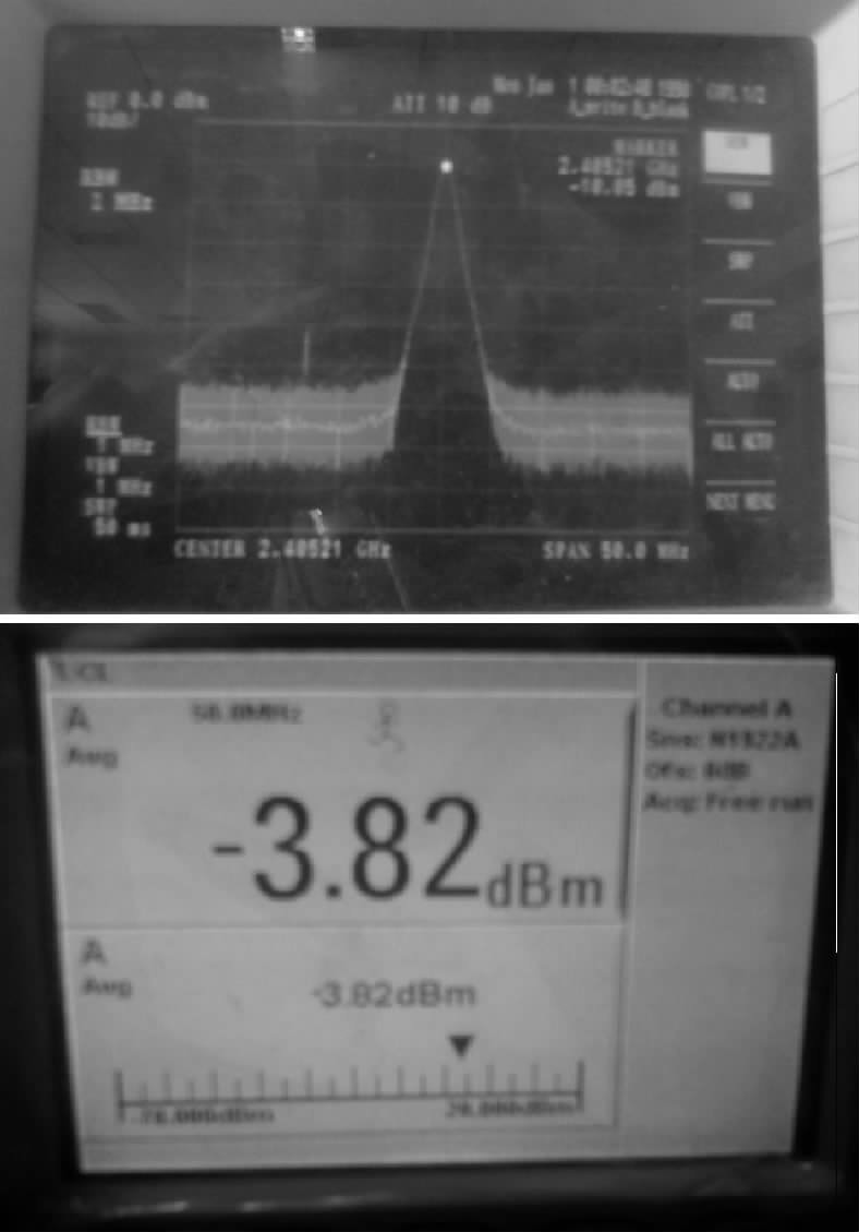 為對設計的節點功能進行驗證,首先使用IAR集成開發環境編寫CC2420的測試程序,通過JTAG將程序燒入Flash,經過檢測,射頻部分較好地滿足了預期。芯片工作頻帶范圍為2.4~2.48 GHz,發射功率為0 dBm.經過頻譜儀和頻率計驗證設計符合要求,驗證結果如圖9所示。