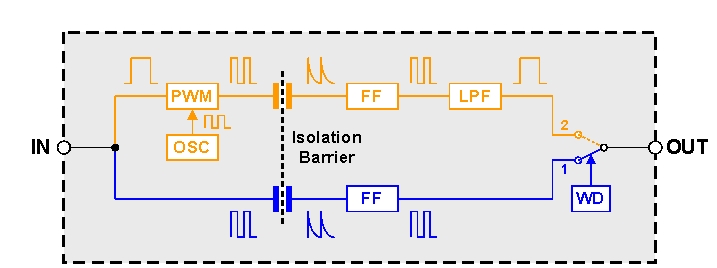 藍色部分所示路徑中處理的高速信號被電容式隔離勢壘分為多個快速瞬變脈沖群。隨后的觸發器(FF)將這些瞬態脈沖群轉換成波形和相位均與輸入信號一致的脈沖。內部看門狗(WD)檢查高速信號邊緣的周期性。在低頻輸入信號情況下,連續信號邊緣間的持續時間超出了看門狗窗口。這樣便迫使看門狗將輸出開關位置從高速路徑(位置1)改變為低速路徑(位置2)