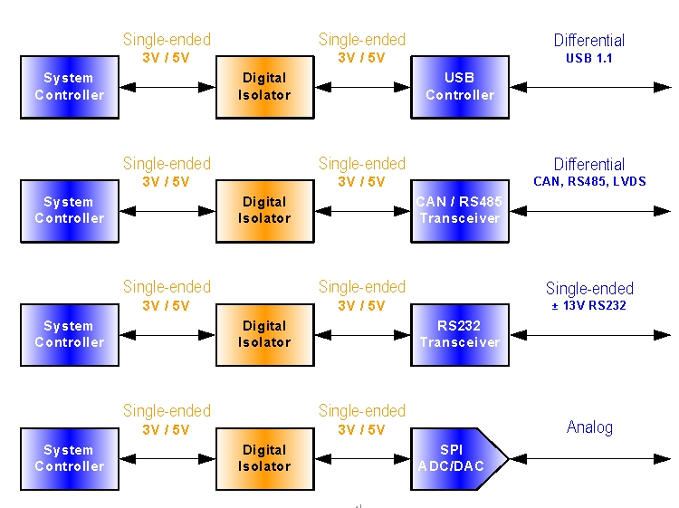 所有接口都有一個相同點,那就是數字隔離器必須安裝在隔離接口的單端