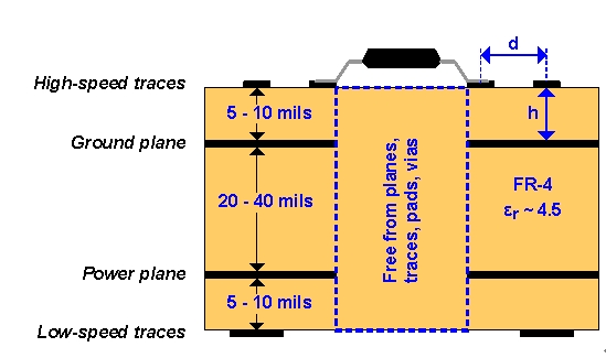 將電源層置于接地層下面。這兩個參考層構成了一個大約為100pF/in2的附加高頻旁路電容器。