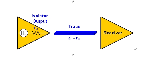 受控阻抗傳輸線是特性阻抗Z0始終受控于其幾何特性的走線。走線長度大于15mm(tr=1ns) 30mm(tr=2ns)時,走線阻抗必須要與隔離器輸出阻抗Z0~rO匹配(如圖4所示),使信號反射最小化。這被稱為源阻抗匹配。