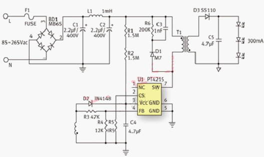 下圖是采用PT4215的3W LED燈杯的典型應用電路。驅(qū)動電路采用反激架構(gòu),工作在DCM模式。采用無光藕設(shè)計,方案簡潔可靠,成本低廉。驅(qū)動電路能夠接受85VAC~265VAC輸入范圍,輸出電流300mA,驅(qū)動3顆1W LED串聯(lián)的燈串。